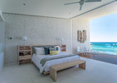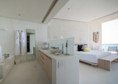 It has seven white suites, all with ocean view and air conditioning, all of them beautifully equipped with white linens, a powerful shower, a closet, and a private bathroom. You will sleep like a baby lulled by the rhythmic sound of the waves.