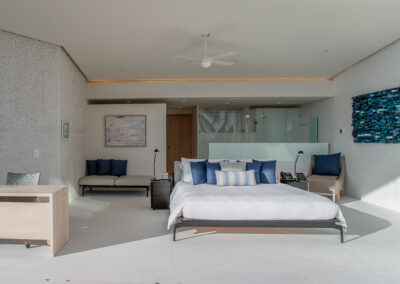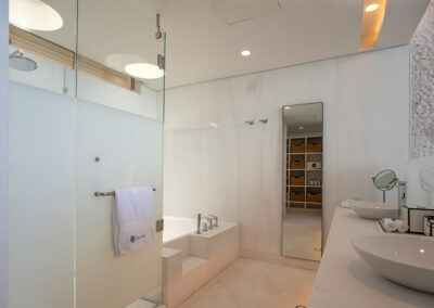 The master suite has a king size bed and TV, and a gigantic terrace with jacuzzi and a lounge. Three of the suites have king size beds, TV and a tub. The other three have two double beds. All the suites have their own terrace and chez-longue to enjoy the breeze, read and have a view of the peaceful ocean. All have Wifi.