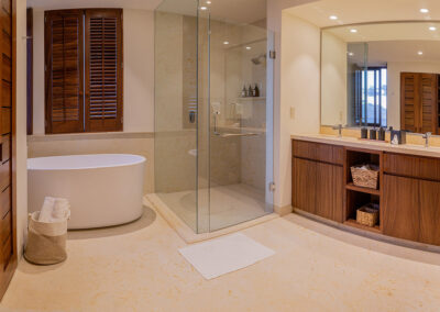 En-suite bathroom with twin vanities, bathtub and separate shower.