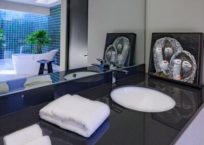 Antolini black quartzite vanity with top mount Kaldewei sink and Hansgrohe fixture