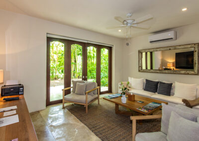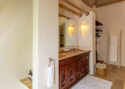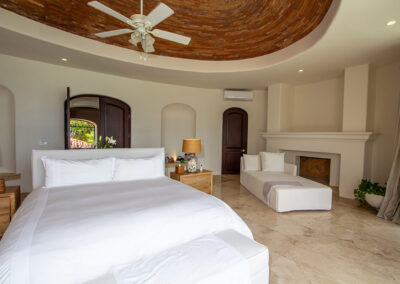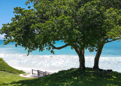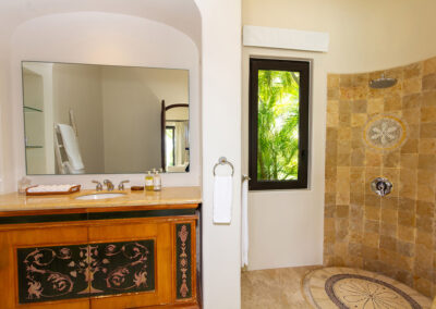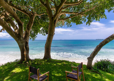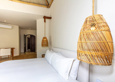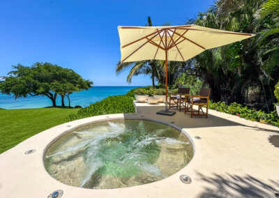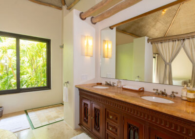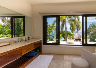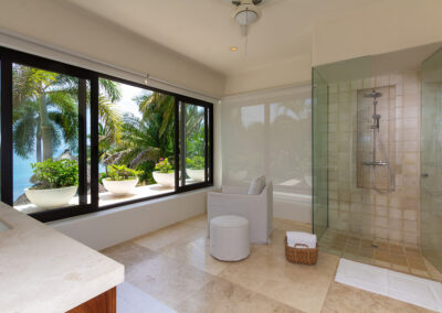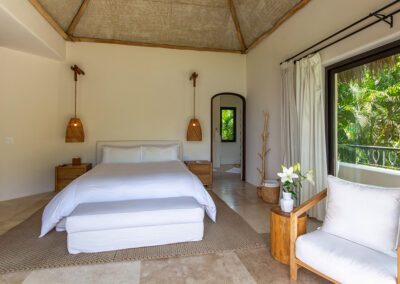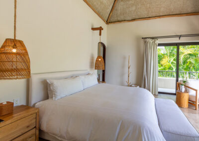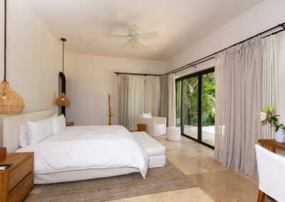 The villa features 4 spacious en-suite bedrooms, thoughtfully designed for privacy and comfort. Two suites showcase uninterrupted ocean views, one overlooks the lush gardens, and one is conveniently located on the ground floor with direct access to the main living areas.